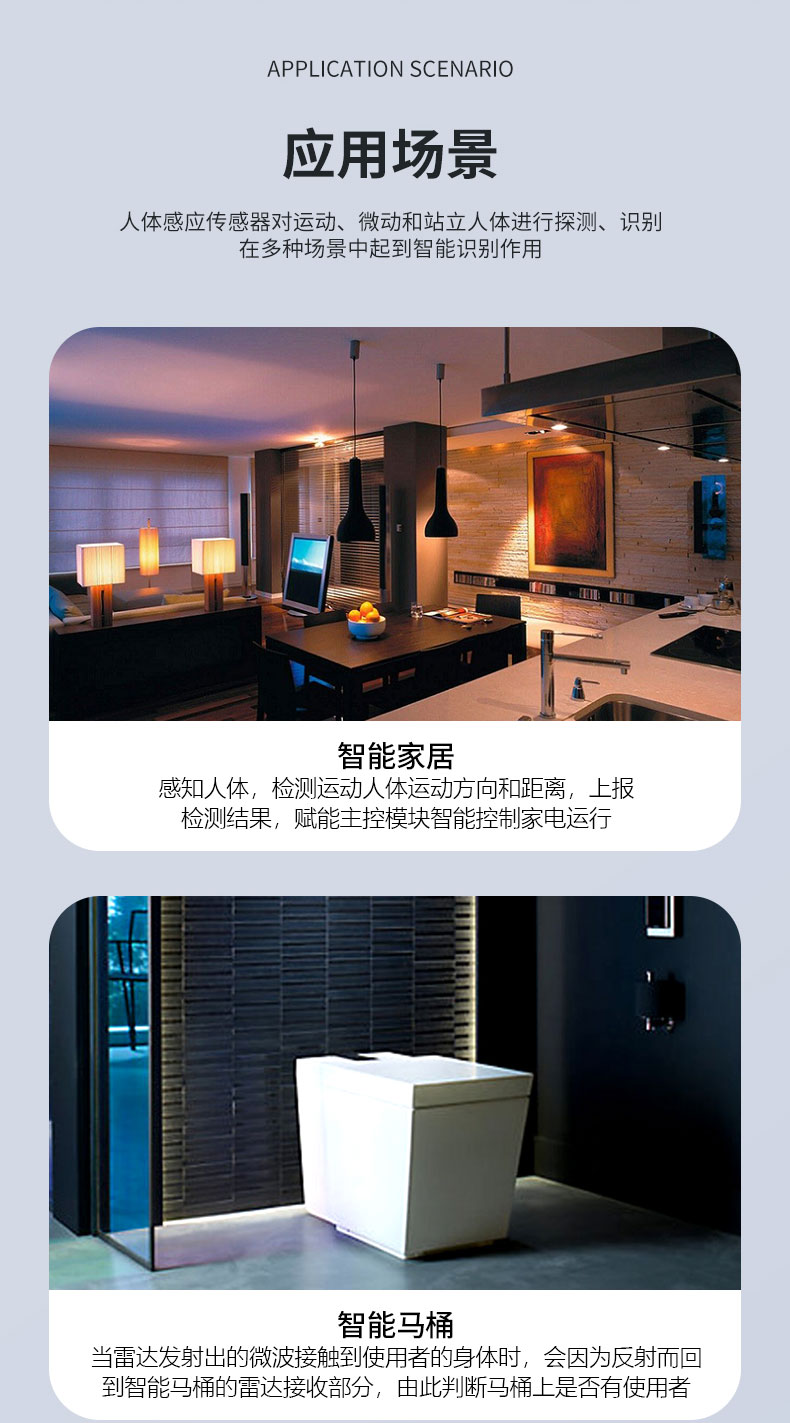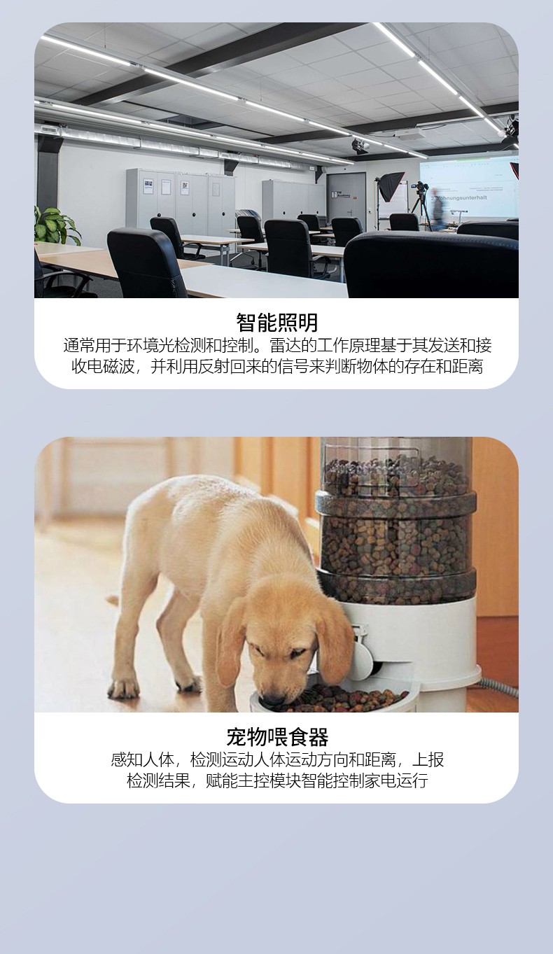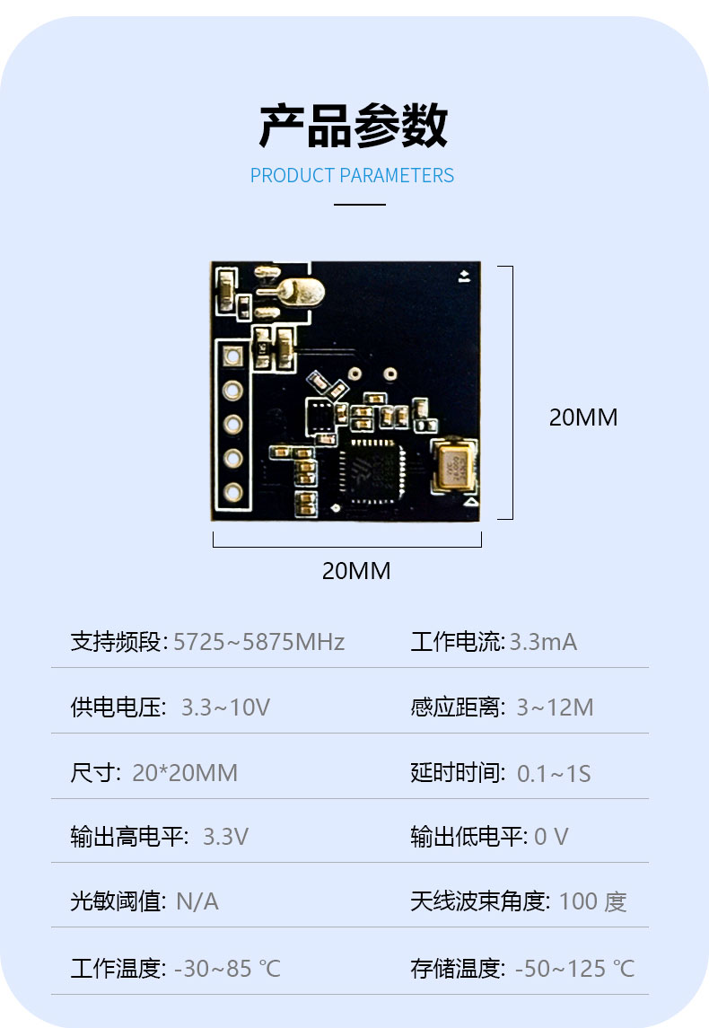 FR58L4LS-2020M-2 簡稱 2020M 是飛睿智能推出的高性能低功耗 5.8G 雷達傳感器,雷達模塊利用多普勒原理,通過天線發射高頻電磁波并接收初期反射波,以此判斷覆蓋范圍內物體的移動,給出相應電信號。模塊尺寸 20*20MM,該模塊集成了 5.8G 微波電路、中頻放大電路以及信號處理器,集成度高且生產一致性好,模塊內置32 位 MCU 和收發天線,大大提高了傳感器的感應性能。雷達模塊感應距離遠、角度廣、無死區、透鏡和透鏡老化問題不受溫度、濕度、氣流、灰塵、噪聲、亮暗等影響。模塊內植入濾雨樹葉算法,能過濾掉雨水樹葉的誤觸發,性能穩定,廣泛應用于智慧照明、智慧安防等多個領域。