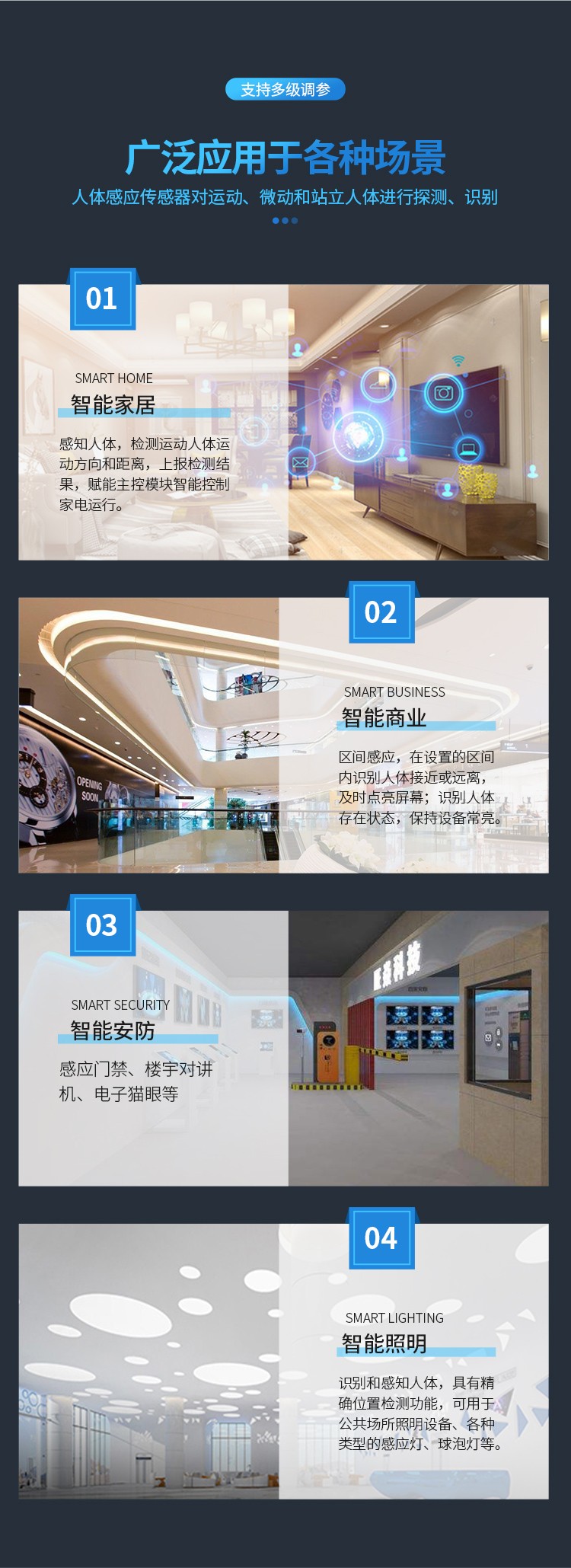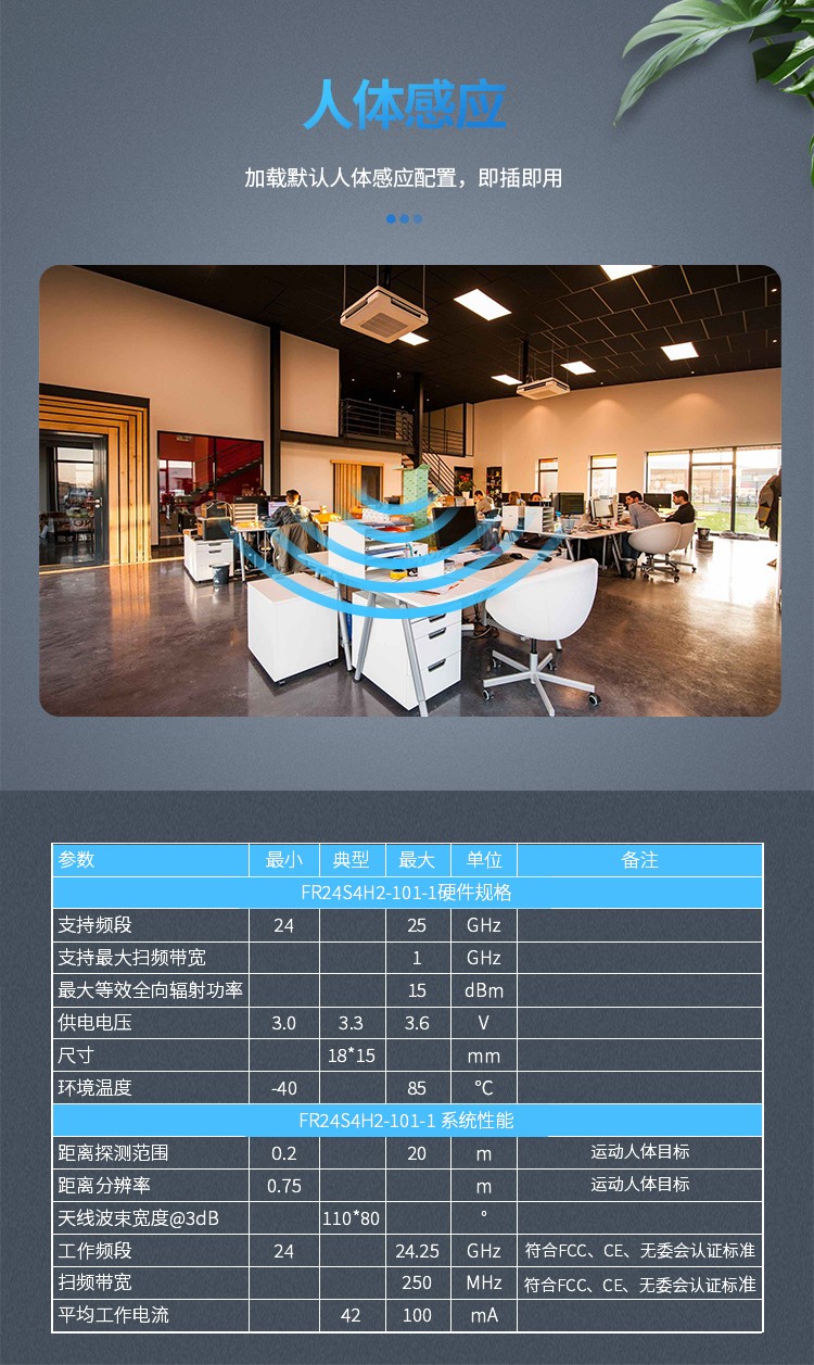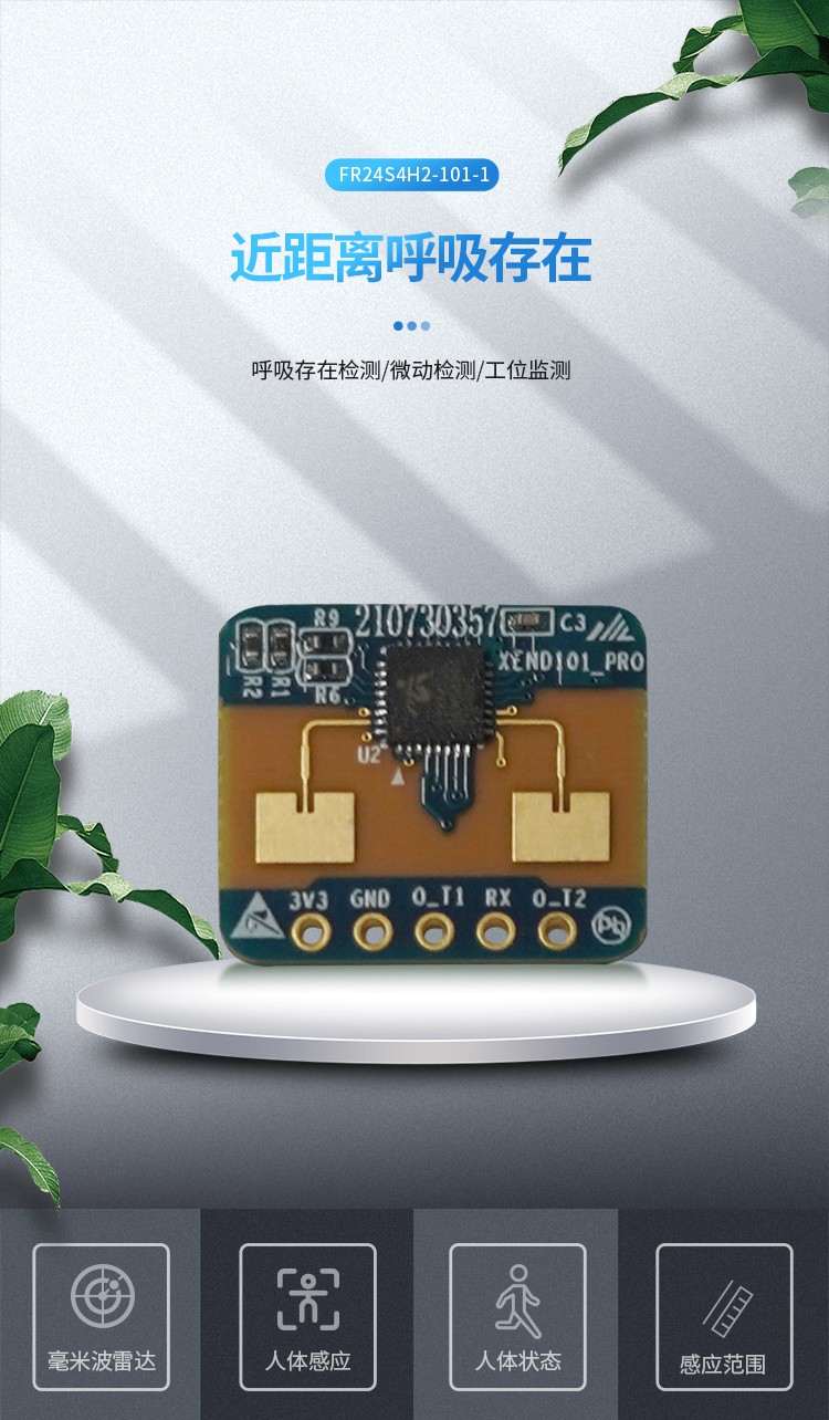 FR24S4H2-101-1 是飛睿智能設(shè)計的人體感應(yīng)傳感器,包含極簡化 24G 雷達(dá)傳感器硬件和智能算法固件。硬件搭載高性能 24GHz 一發(fā)一收天線和外圍電路;人體感應(yīng)算法,采用毫米波雷達(dá)距離測量技術(shù)和高性能芯片先進(jìn)的專有信號處理技術(shù),實現(xiàn)對運動、微動和站立人體的精確感知。固件主要應(yīng)用在室內(nèi)場景,感知區(qū)域內(nèi)是否有運動或者微動的人體,實時刷新檢測結(jié)果。對運動人體的最遠(yuǎn)感應(yīng)距離為 20 米,可輕松配置感應(yīng)距離范圍、不同區(qū)間的感應(yīng)靈敏度及刷新時間,支持 GPIO 和 UART 接口,即插即用,靈活應(yīng)用于不同的智能場景和終端產(chǎn)品。